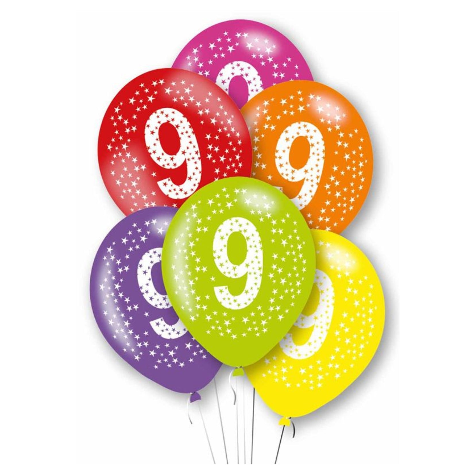 11"/ 27cm MULTICOLOURED AGE '9' 6 PACK LATEX BALLOONS