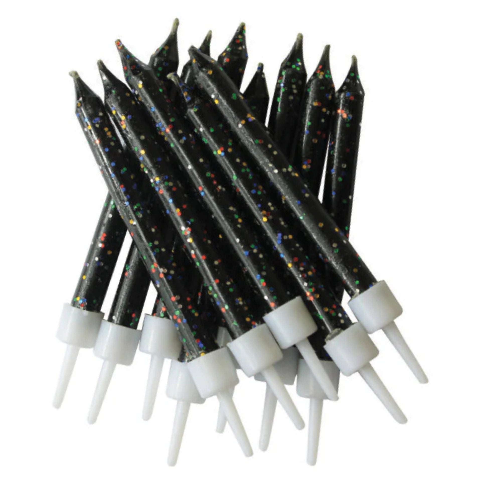 3"/ 7.5cm BLACK GLITTER BIRTHDAY CANDLES WITH HOLDERS (12 PACK)