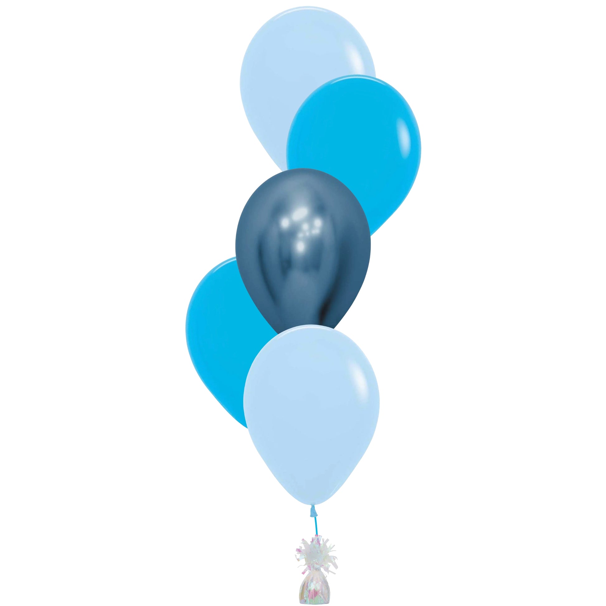 Create an instant celebration with this charming Blue Latex Cluster! This delightful set includes 2 x classic Blue Balloons, 2 x soft Pastel Blue Balloons and 1 x stunning Blue Chrome Balloon that catches the light beautifully. The included Iridescent Balloon Weight keeps everything perfectly anchored and adds an extra sparkle to your display.
